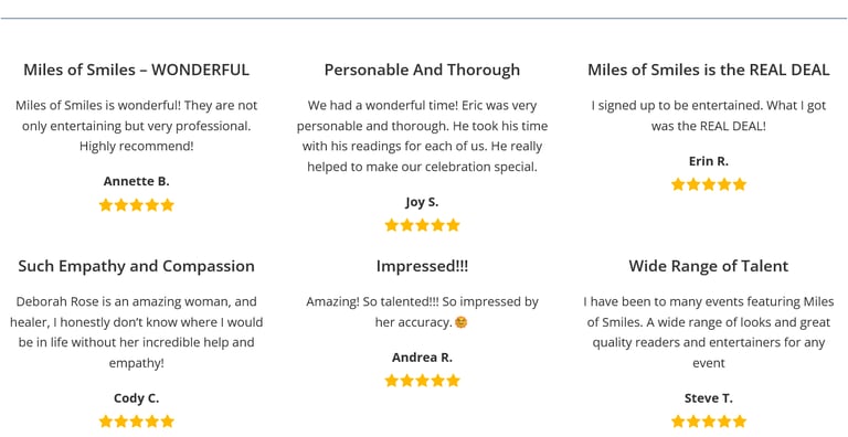 At Miles of Smiles Events, we take a positive approach to intuitive entertainment. Our readers focus on encouragement, insight, and possibility. Guests leave feeling uplifted and curious about what lies ahead. You won’t hear gloomy predictions or frightening messages at our table.